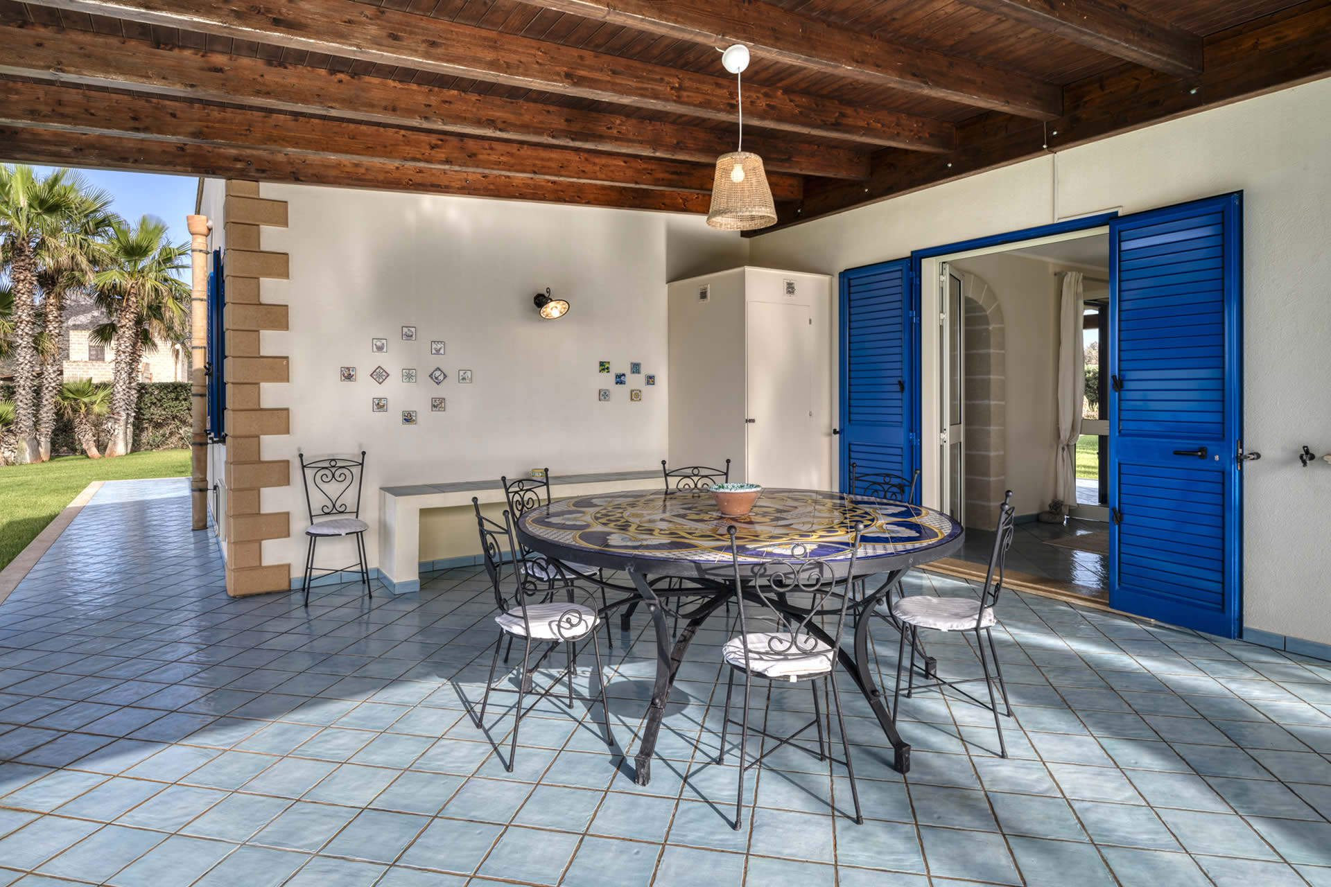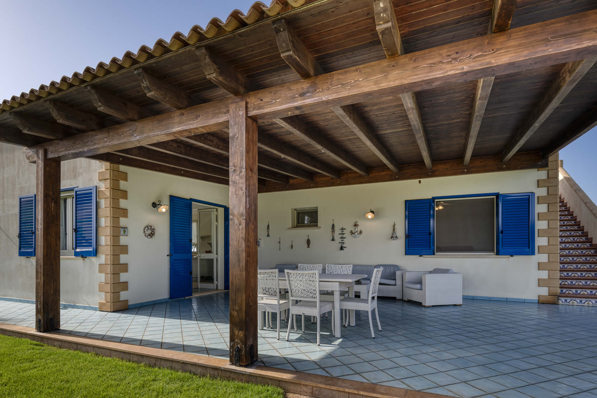 La villa dispone inoltre di una pratica zona lavanderia, dotata di lavatrice, ferro e asse da stiro, stendibiancheria e un ripostiglio con aspirapolvere e attrezzatura per la pulizia.