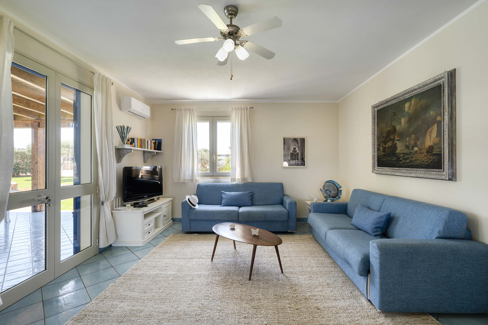Gli interni della villa sono spaziosi ed eleganti, progettati per garantire massimo comfort. Due accoglienti camere matrimoniali, due bagni con doccia e un ampio soggiorno con due comodi divani letto offrono spazio e privacy per tutti gli ospiti.