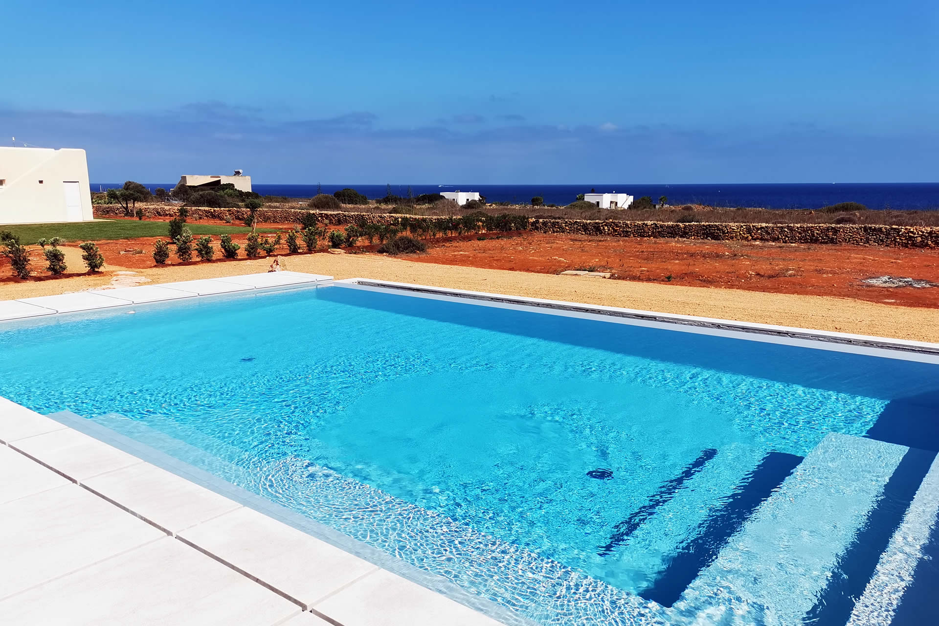 La piscina è a disposizione di tutte le ville di Cala Virdi, garantendo spazi ampi e momenti di relax ideali per coppie, famiglie o gruppi in cerca di una vacanza a Favignana tra comfort e bellezza autentica.